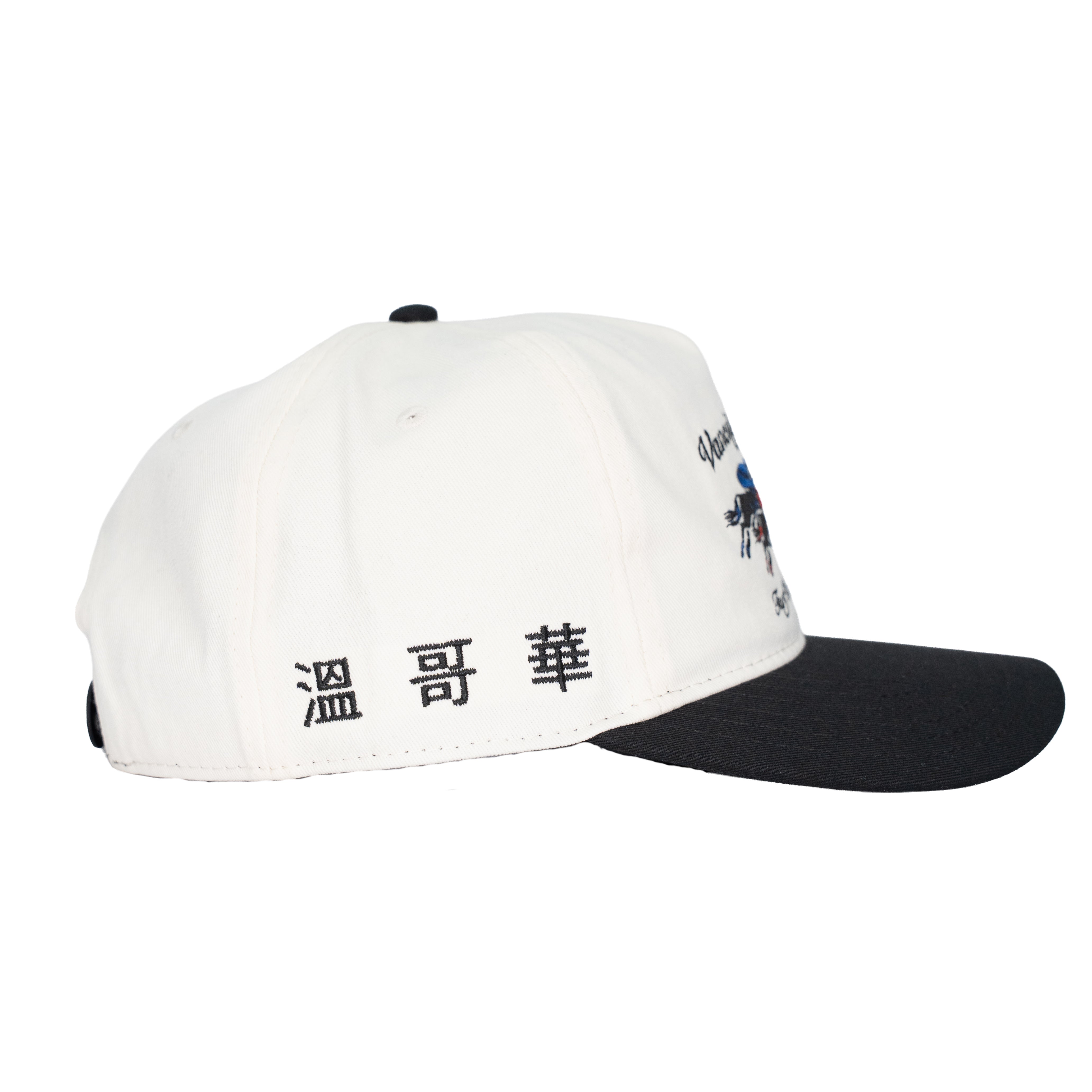 Custom 5 panel cotton twill snapback with unstructured crown and front embroidered turf club design and 'Vancouver' chinese characters on the side panel. Available in 3 colourways.
