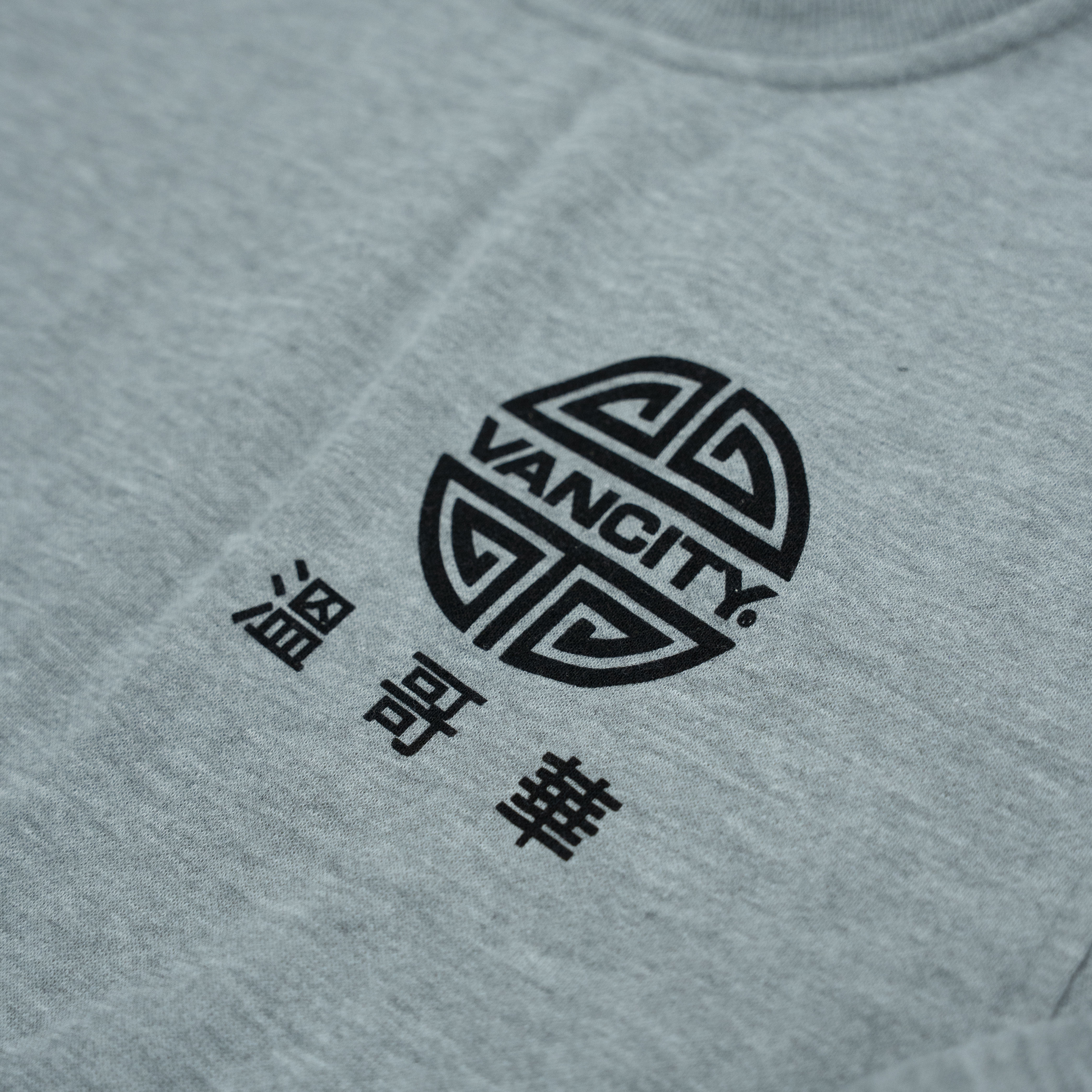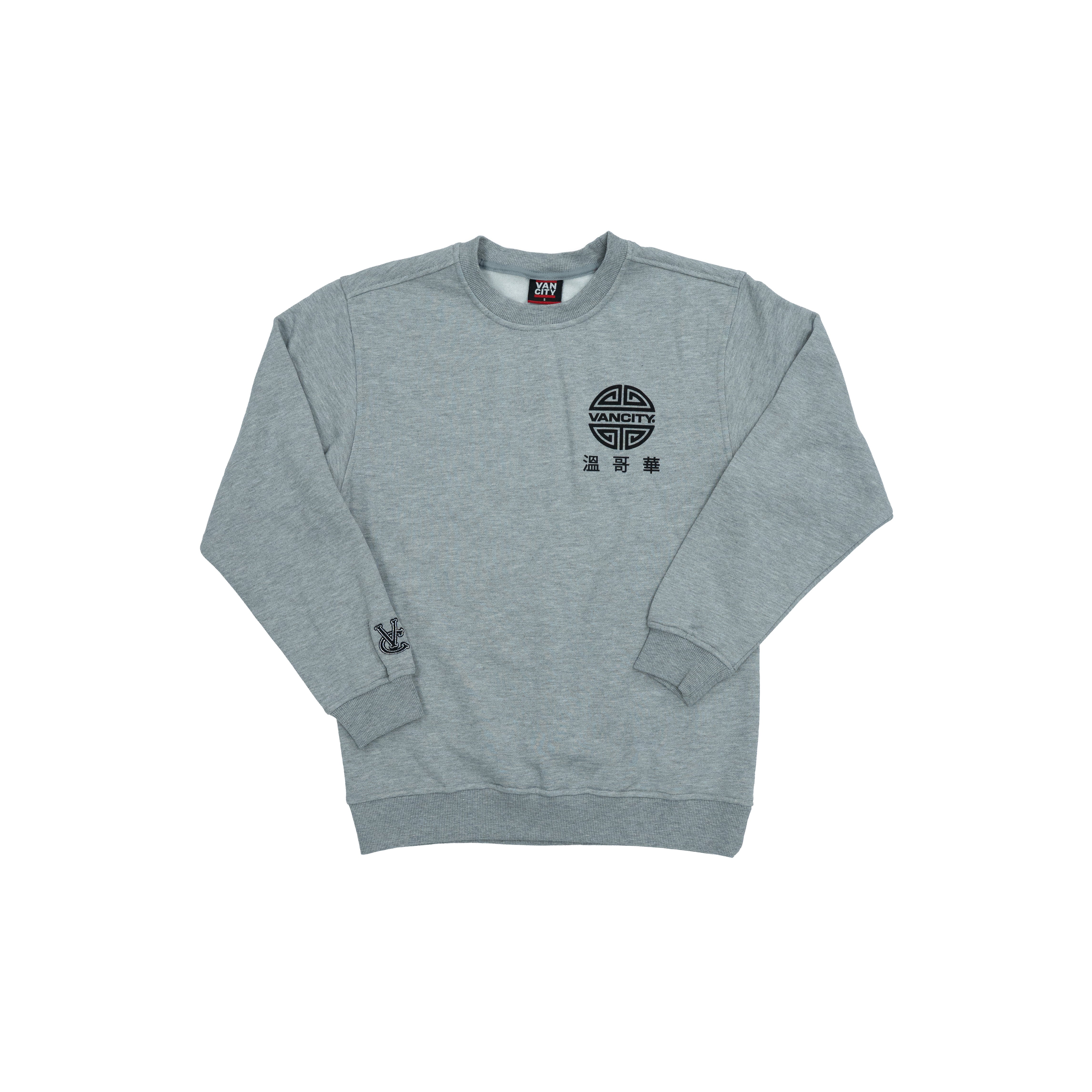 Screen printed front "Vangevity" longevity logo with 'Vancouver' Chinese characters and full colour turf club back design on the unisex Vancity Original Crewneck, Available in sizes from XS to XXL